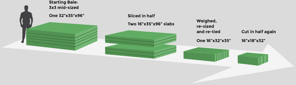 In a nutshell, our 3600 Bale Conversion System takes large, 8-foot long bales (either 32”x35,” 46”x35” or 46”x51”) and outputs small, 16”x18”x 24” to 44” bales. This process involves a series of slicing blades, a compression chamber, and a tying unit which automatically converts the bales and restacks them for handling. Power for the system is delivered via an electric or diesel powered hydraulic system consisting of multiple pumps. Automation is controlled via a PLC (programmable logic controller), with full operator manual overrides and safety shutdowns.
